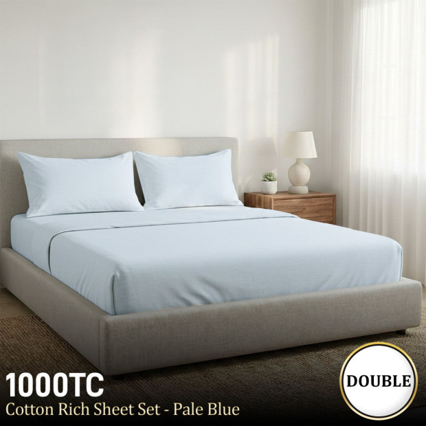 1000 Thread Count Cotton Rich Blue Double Bed Sheet Set 4 Piece in Pale Blue