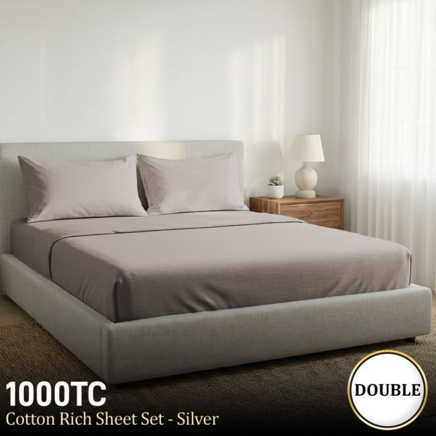 1000 Thread Count Cotton Rich Double Bed Sheet Set 4 Piece in Silver