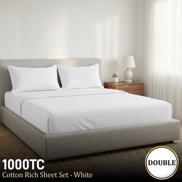 1000 Thread Count Cotton Rich Double Bed Sheet Set 4 Piece in White