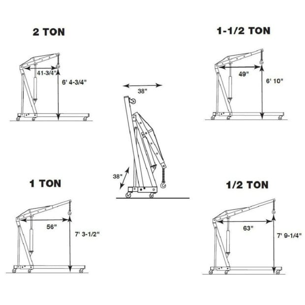 The 2 Ton folding engine crane has a lifting capacity of 2000 KG. This engine hoist features a drop-forged steel hook that swivels 360 degrees for ease of use and safety during operations. It comprises heavy gauge structural steel and low-profile 4.7-inch legs designed to fit under a wide range of vehicles. Its space-saving design folds to store away in a small footprint conveniently.