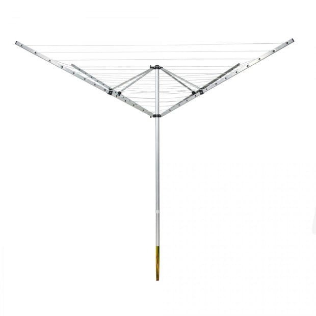Made from heavy-duty steel and PVC-coated line, this rotary dryer is designed to last, even under heavy use. With a full 50 meters of line to hang your laundry, you'll be able to dry even large loads with ease. Its 38-millimeter solid stainless steel pole supports heavy loads no matter how hard the wind blows. It's easy to use – just press the trigger and release the arms, and you'll be ready to go in mere seconds.
