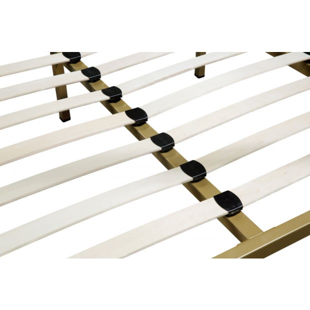 The bed's sleek gold frame is trendy and modern, making it a perfect choice for the 21st Century home. But if you prefer a more 'old-style', romantic look, its modest design means that it is easily dressed with drapes in order to achieve the style you want. What's more, the frame's neutral gold allows it to fit in with any colour scheme - Versatility at its best.