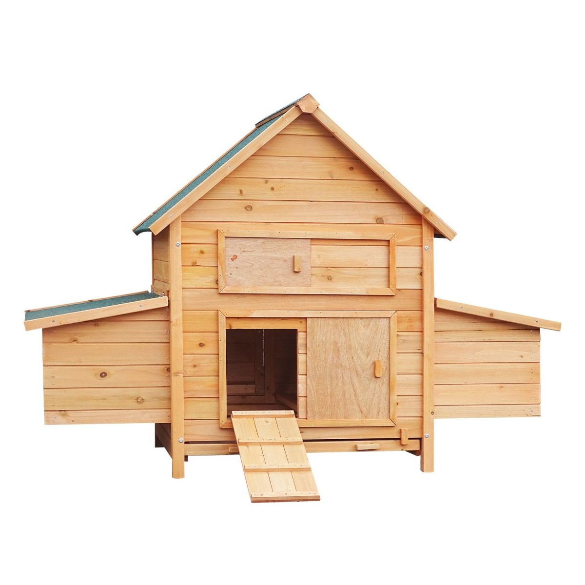 The hutch features an asphalt roof that provides dependable protection against rain and harsh sunlight. Cleaning is effortless with the removable zinc tray, making maintenance hassle-free. Inside the enclosure includes a ramp access to allow your pets to move up and down effortlessly. It also has a built-in nesting box that provides a secure and cosy spot for your hens to comfortably lay their eggs.