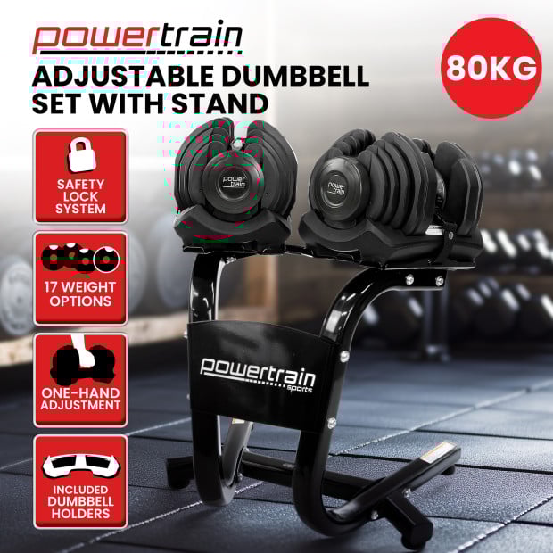 80kg dumbbell set by Powertrain - 2 x 40kg Adjustable plus stand