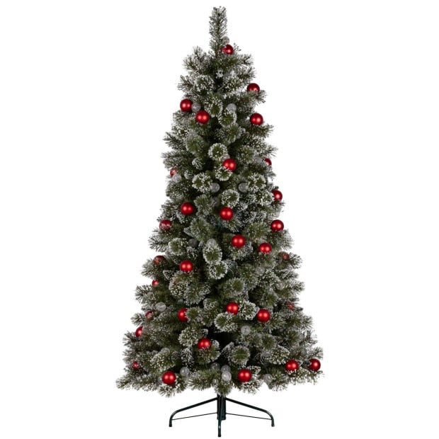 Perfect for fitting tighter spaces and corners, the 7.5ft (229cm) slim Snowy Bristle Christmas Tree boasts a slimmer build than our standard Snowy Bristle model but retains all of its charm and beauty. It features frosted snow bristle tips and is pre-decorated with vibrant red baubles for a truly festive appeal. The 220 LED snowball lights offer 11 light functions, including colour, warm white and various mixes, creating a magical holiday atmosphere.