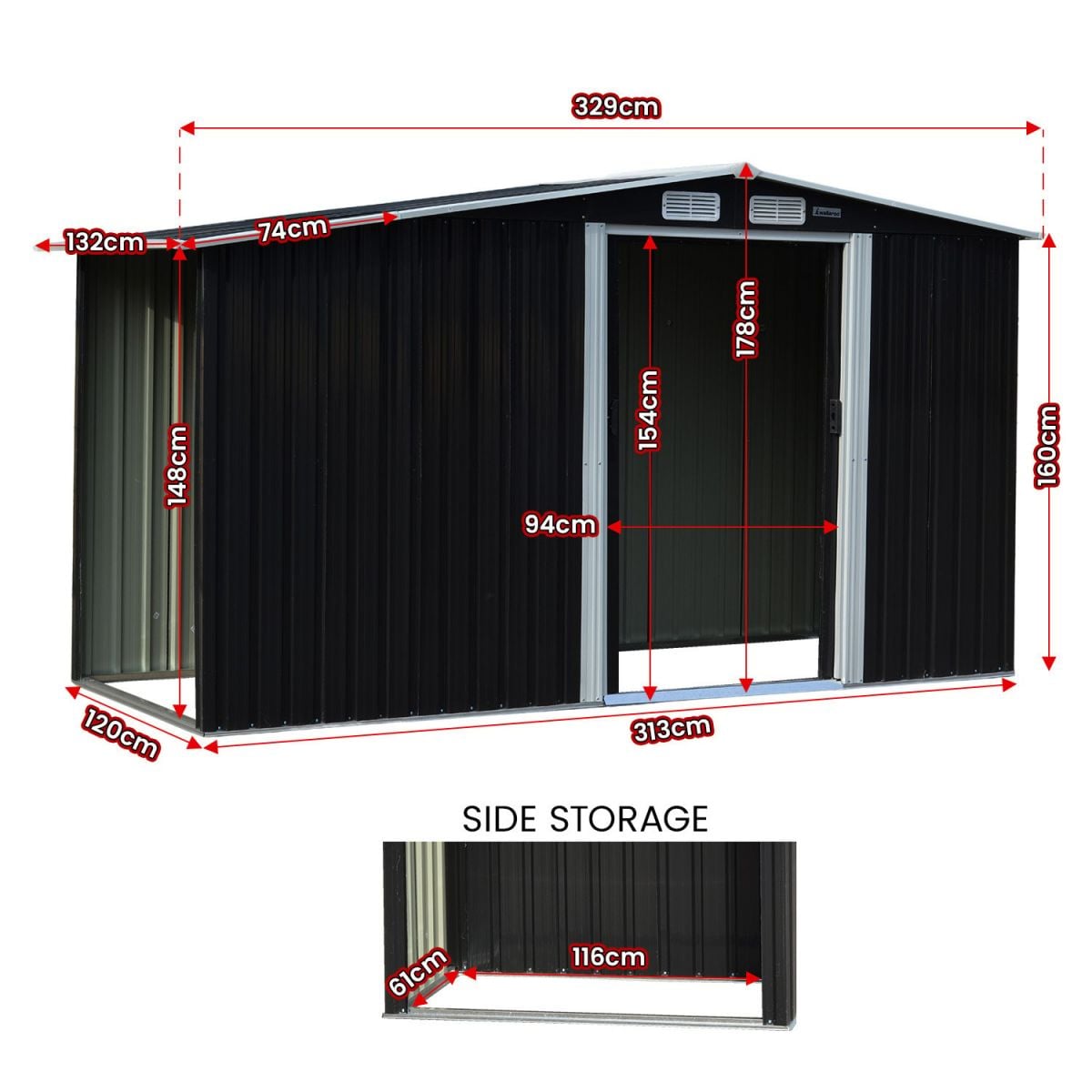 - Shed Dimensions (W x H x D): 257 x 178 x 205cm